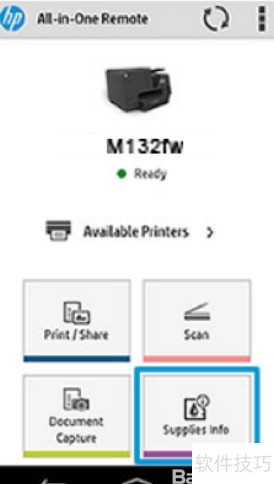 7、 通过使用 HP All-in-One Printer Remote 应用程序,您可以在手机或平板电脑上查看惠普小超人m132fw的碳粉余量。打开应用后,若尚未选择设备,请先选定您的打印机。随后根据所用设备的不同,点击耗材状态或打印机设置图标即可查看相关信息。请注意,由于操作系统及设备品牌存在差异,实际界面中的菜单名称、图标样式可能与描述略有不同,操作时请以屏幕显示为准。