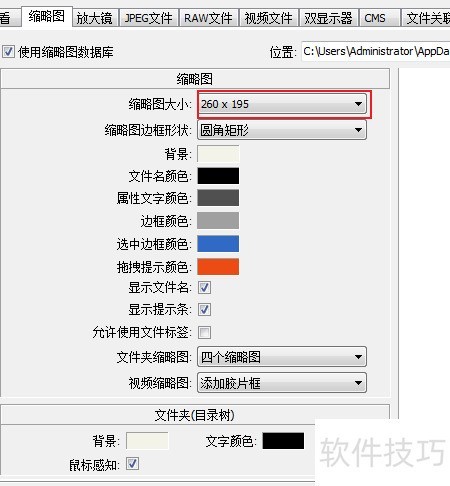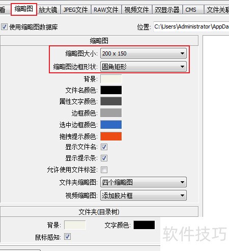 3、 打开设置窗口,选择缩略图选项卡,在此可调整缩略图尺寸,默认为200x150,并可自定义边框样式。