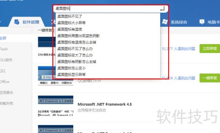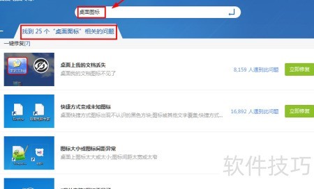 5、 对于不熟悉电脑操作的用户,可使用模糊搜索功能。页面顶部设有搜索框,只需输入大致问题,如桌面图标,系统便会立即显示25个相关故障及解决方法,操作便捷,十分贴心。