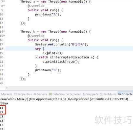 11、 将a.join()修改为a.join(20),运行程序后,控制台输出显示:在线程a执行未完成时,线程b便已开始运行,表明设置时间限制后,两线程的执行顺序发生了变化。