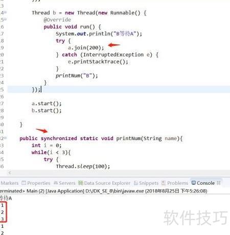 13、 对 printNum 方法添加锁后运行程序,控制台输出结果显示:即使在 join() 方法中设置了时间限制,线程 b 仍需等待线程 a 完全执行完毕并释放锁后才能继续执行,体现出锁的同步控制作用。