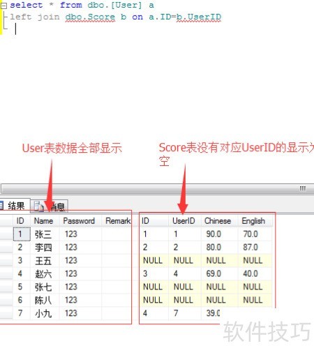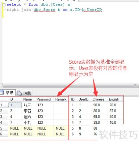 4、 使用User表右连接Score表编写查询语句,结果包含Score表的所有数据。当User表中没有与Score表对应的UserID时,User表相关字段显示为空值。具体效果所示。