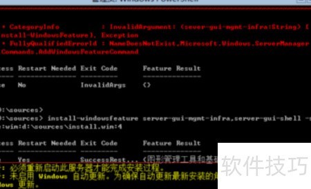 4、 接下来输入命令:Install-WindowsFeature server-gui-mgmt-infra,server-gui-shell –source:wim:d:sourcesinstall.wim:2(或4),用于安装图形管理界面和外壳功能,其中镜像源路径指向D盘的install.wim文件,编号2或4对应不同的系统版本索引,需根据实际环境选择正确的索引号以确保安装成功。