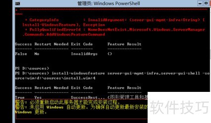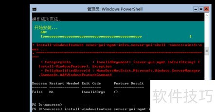 16、 继续执行命令:Install-WindowsFeature server-gui-mgmt-infra,server-gui-shell –source:wim:d:sourcesinstall.wim:2,通过指定WIM镜像文件中的索引2作为安装源,部署服务器图形化管理工具及外壳界面,确保系统具备完整的GUI管理功能。
