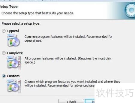 7、 安装类型提供三种模式:典型、完全和自定义。建议选择自定义模式,以便根据需求调整设置,随后点击下一步继续安装流程。