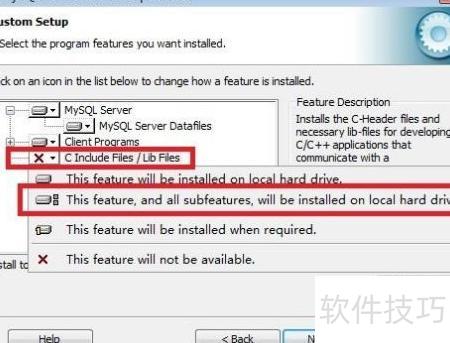 12、 在Developer Components(开发者组件)上点击鼠标左键,随后选择此功能及所有子功能将安装到本地硬盘,确保该组件及其下属内容完整安装至计算机。对列表中的MySQL Server(MySQL服务器)、Client Programs(客户端程序)以及Documentation(文档)等项目,同样进行相同操作,逐一设置为全部安装到本地硬盘,以确保所有相关文件均被完整部署,避免出现缺失组件的情况。完成上述配置后,点击Change...按钮,进入安装路径设置界面。此时可手动输入或浏览选择目标文件夹,自定义软件的安装目录,以便更好地管理文件位置和磁盘空间。建议选择空间充足、路径清晰的目录进行安装,防止后续使用过程中因路径问题导致运行异常。全部设置确认无误后,继续执行下一步安装流程,确保整个MySQL系统按需完整部署。