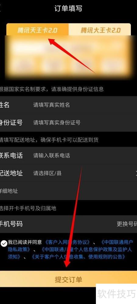 4、 选择腾讯王卡2.0,填写相关信息并提交订单即可完成办理。
