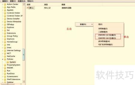 3、 在窗口右侧空白区域点击鼠标右键,从弹出的菜单中选择新建选项,然后在其子菜单中点击DWORD(32位)值。若使用的是64位系统,则应选择DWORD(64位)值进行创建。