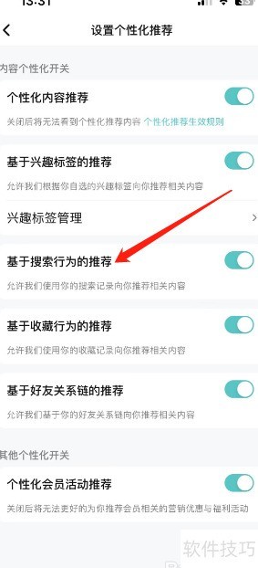 3、 点击基于搜索行为的推荐,开启右侧开关即可。