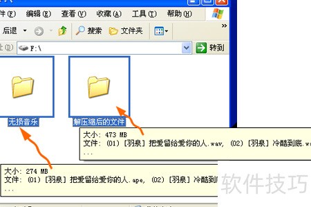 6、 从图表数据可以看出,原始ape格式音乐文件为274MB,解压成wav无损格式后达到473MB,容量增加了约200MB。