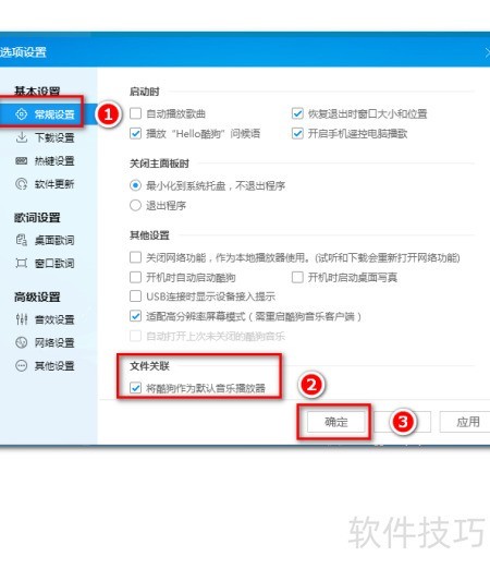 4、 打开酷狗音乐,进入设置中的常规选项,找到文件关联,勾选默认播放器,最后确认保存即可。