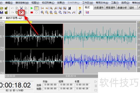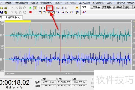 12、 将鼠标点击波形图中代表当前播放位置的红线,若难以精准定位,可滚动鼠标滚轮放大波形以便操作。确认位置后,点击工具栏中的选到开头按钮,即可选中从文件起始至当前位置的全部区域。