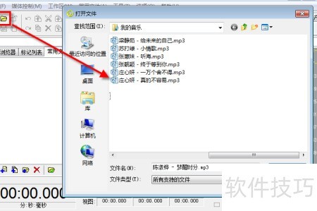 8、 点击左上角打开按钮,选择并载入所需音乐文件即可。