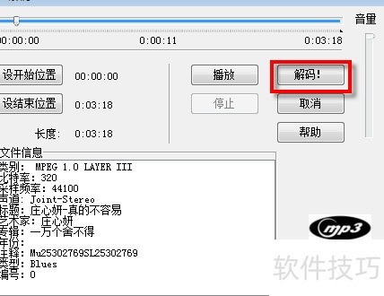 9、 弹出对话框后可试听音乐,支持设定起止时间。本次暂不进行裁剪操作,直接点击解码按钮即可继续下一步。