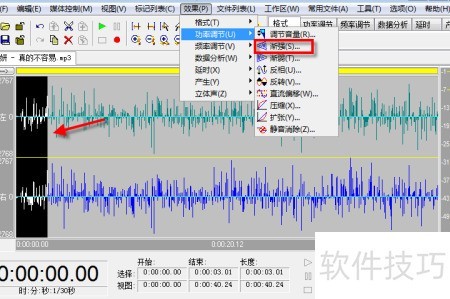 15、 选取开头3至5秒的片段,点击效果菜单,选择功率调节,再点击渐强功能即可。