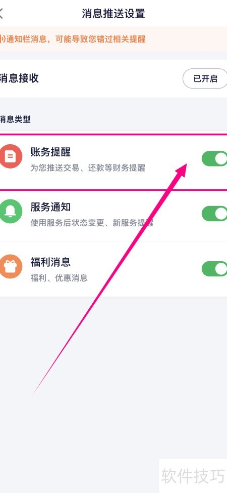 3、 进入推送设置,开启账务提醒功能,操作所示。
