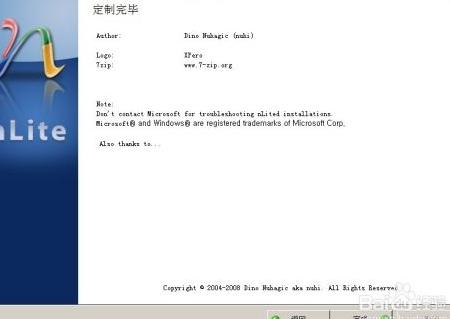 17、 完成定制后,点击完成退出Nlite软件。接下来将ISO镜像刻录为可启动光盘并安装系统,此过程较为常见,此处不再赘述。