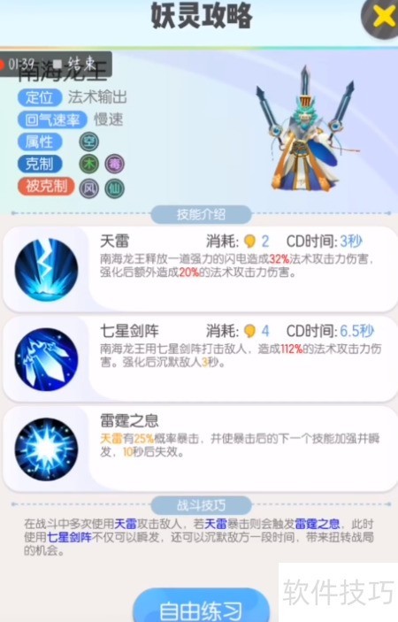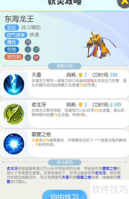 6、 南海龙王为风属性法术输出角色,技能主要以攻击为主,其二技能可对敌人施加沉默效果,具备较强的控场与输出能力。