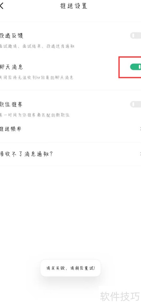 3、 进入推送设置页面,开启聊天消息按钮即可。