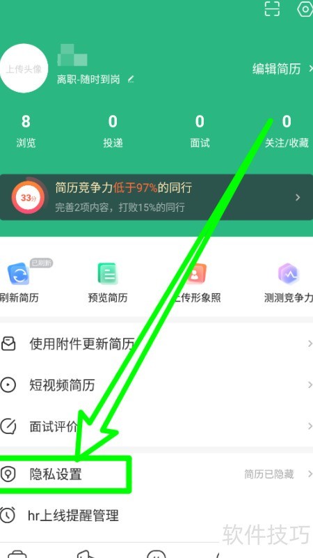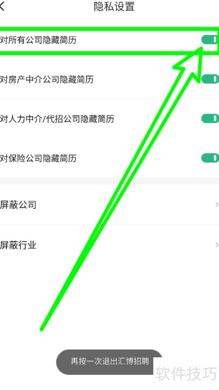 3、 进入隐私设置,选择隐藏简历至所有企业可见。