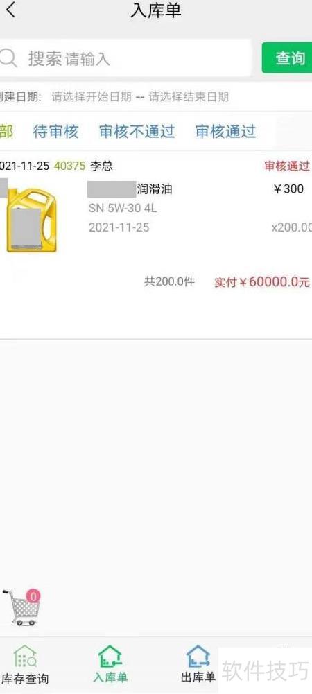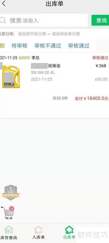 7、 库存充足即可办理出库,点击购物车进入查询页面,选定商品后提交出库申请完成操作。