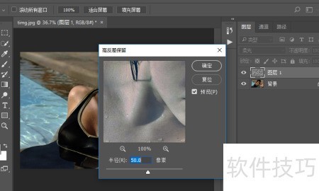 5、 为图层1应用高反差保留滤镜,参数设置参照示意图。