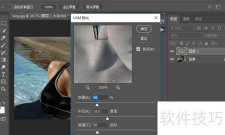 6、 应用滤镜中的USM锐化功能,具体参数设置参考图示。