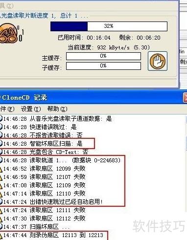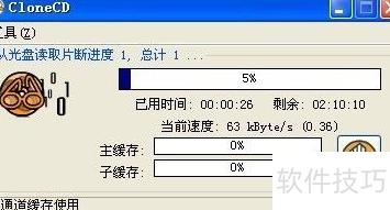 4、 在尝试读取光盘未果后,只得将其取出仔细检查。观察发现,靠近光盘内圈位置存在两条清晰可见的环形痕迹,这正是当前较为先进的光盘加密技术——防盗圈。所谓防盗圈,实际上是人为制造的物理性坏道,属于一种隐蔽而高效的防复制手段。当光驱激光头读取到这一区域时,会因无法识别数据而中断读取过程,导致常规软件无法完整读取光盘内容。使用如NERO这类普通刻录工具时,往往会在遇到此类坏道时出现卡顿甚至系统死机的情况。为解决这一问题,需借助专用工具CloneCD进行处理。该软件具备绕过人为坏道的能力,能够对光盘实施全盘精确复制,实现1:1的镜像制作。在运行过程中,软件界面会提示某些扇区读取失败,同时光驱内部发出连续的咔咔声响,这些均属于正常现象。CloneCD的核心优势在于其强大的容错机制,即便面对加密或保护措施,仍可跳过异常区域,将有效数据完整提取并生成镜像文件,从而成功突破防盗圈的技术限制。