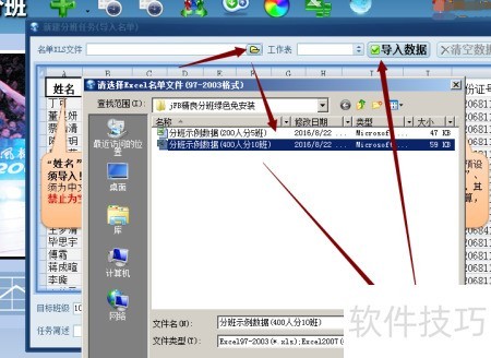23、 选取已整理的待分班学生表文件,选定包含本次分班数据的工作表,然后点击导入数据按钮完成操作。