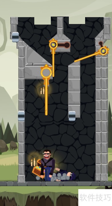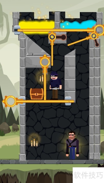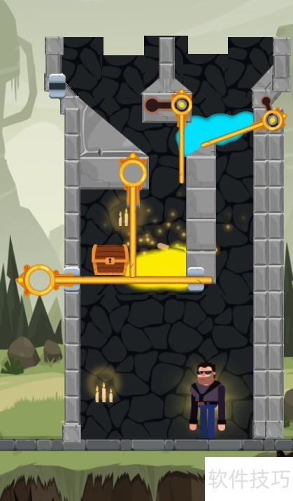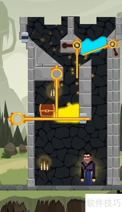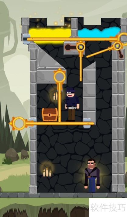 1、 本关目标是取得宝箱,劫匪位于宝箱右侧,上方为熔岩,熔岩右边是水,黑衣男子站在水的下方,布局所示。