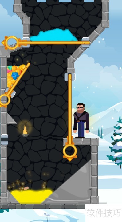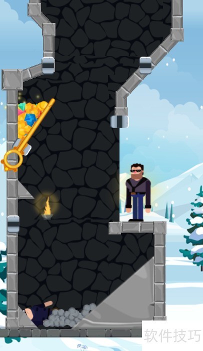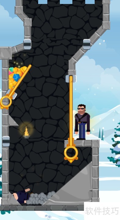 1、 本关目标为夺取宝藏,匪徒位于宝藏下方,黑衣男子在匪徒右侧,场景内共有四个插销,具体布局见示意图。