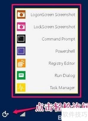 3、 图中选项依次为:截取登录界面、截取锁屏界面、启动CMD命令提示符、打开PowerShell窗口、进入注册表编辑器、调出运行对话框,以及启动任务管理器。