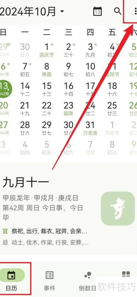 1、 打开一叶日历应用,进入日历页面后,点击右上角的三点图标。