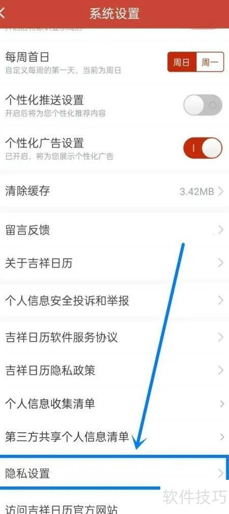 1、 打开吉祥日历应用,进入设置,选择隐私设置选项。