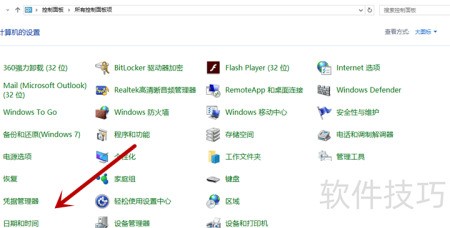 1、 打开控制面板,选择日期和时间设置。