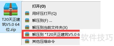 1、 右键点击文件,选择解压到T20天正建筑V5.0文件夹中。