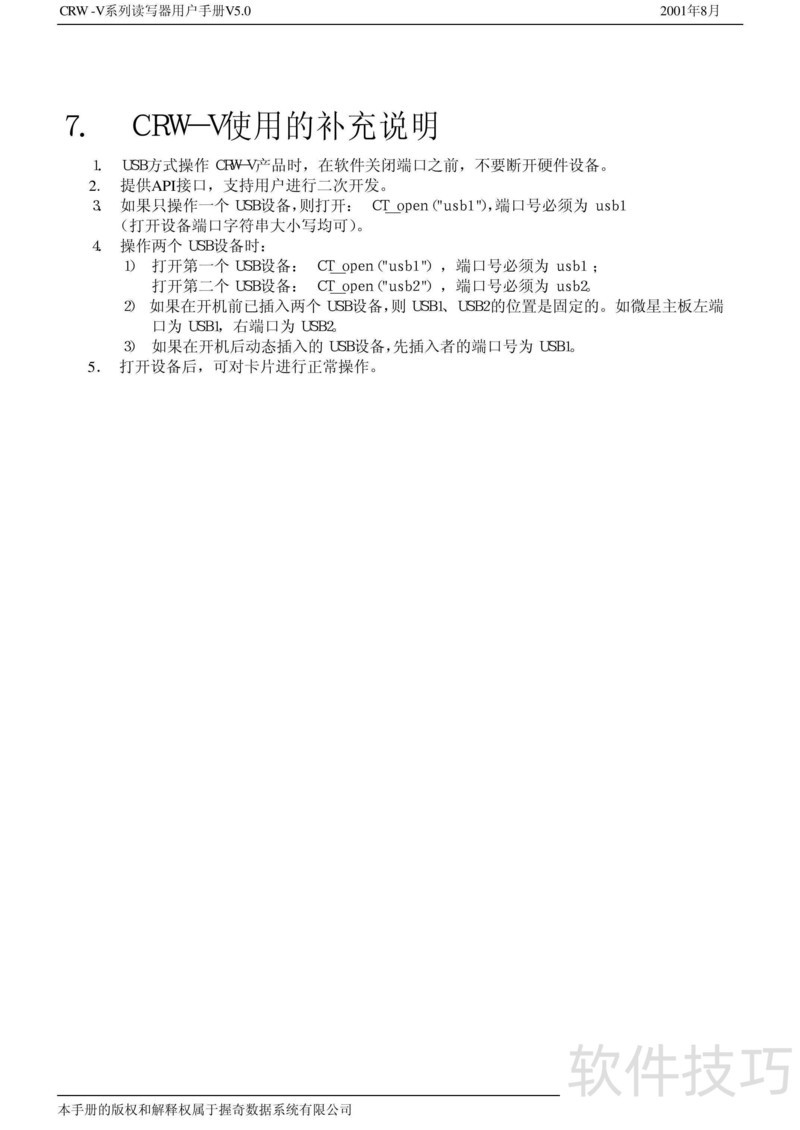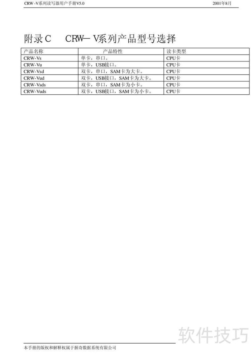 本文为CRW-V系列读写器用户手册V5.0,详细说明产品操作方法及常见问题处理方案。