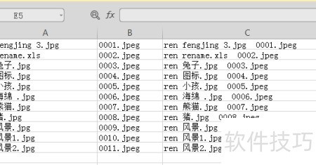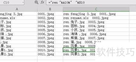 3、 在C列输入公式=ren &A1& &B1,引用A1和B1单元格内容生成新名称并显示在C1,随后向下拖动填充公式。也可使用MID函数或其他方式组合,如=REN&A1& &B1&C1,注意确保结果包含所需后缀。