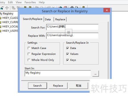 5、 启动Registry Toolkit程序,进入File菜单,选择Search or replace in registry…功能。在搜索框中输入目标路径字符串C:Users梦蝶,将替换字段同样设置为C:Users梦蝶。确保勾选Data、Values和Keys三项,以覆盖所有相关注册表项。切换至replace选项卡,启用No Prompts模式,避免每次替换时弹出确认提示。最后点击Replace按钮,系统将自动完成全部匹配项的替换操作,无需手动干预,提升效率并减少出错可能。整个过程需确保路径准确,防止误改其他注册表内容。