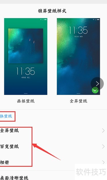 6、 在锁屏壁纸样式下方可见换壁纸选项,可选择全屏壁纸、百变壁纸或相册中的图片设为壁纸。