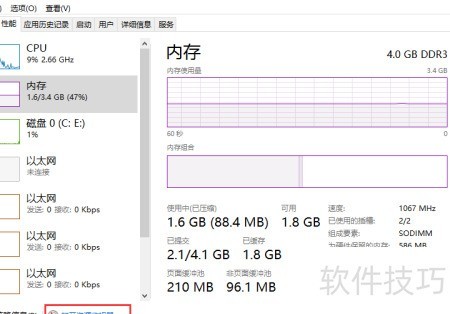 5、 在性能选项中进入界面后,下方即可找到打开资源监视器的功能入口。