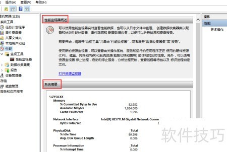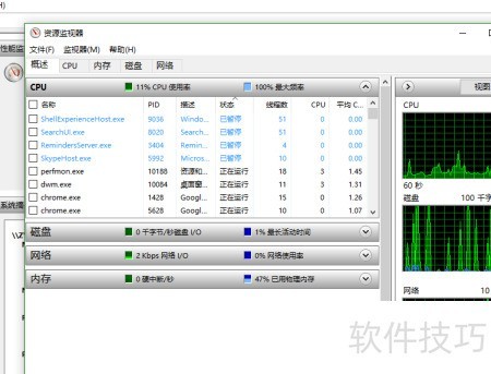 3、 点击性能监视器概述中的打开资源监视器,即可进入资源监视器界面。
