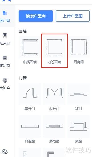 7、 在画户型中选择内线画墙,可设定墙厚并启用吸附或正交功能。