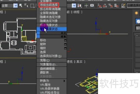 7、 右键点击平面图,选择冻结当前对象,即可固定其位置。完成此操作后,CAD图纸便成功导入3ds Max场景中,不会轻易移动。