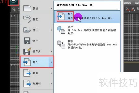 2、 启动3dsmax,依次选择文件菜单、导入选项及其下拉箭头,选取所需外部文件格式导入到软件中完成操作。