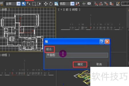 5、 将CAD图形导入3ds Max后,按Ctrl+A全选图形,再通过Ctrl+J将其组合,命名为平面图,最后点击确认完成操作。