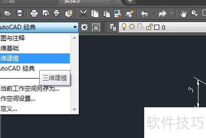1、 打开需转换的3D图纸,点击左上角选项栏,选择三维建模功能即可进行2D转化操作。