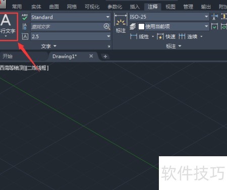 1、 启动CAD软件,进入三维建模界面,点击注释菜单中的多行文字功能,具体位置见图示。