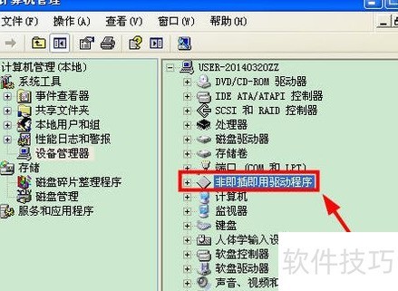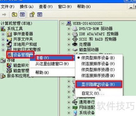 3、 进入控制面板,打开管理工具中的计算机管理,右键点击设备管理器,在下拉菜单中选择显示隐藏的设备,操作步骤所示。