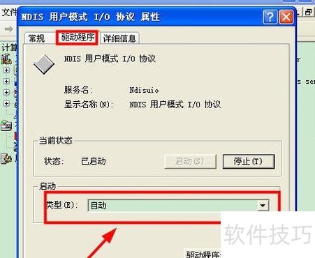 4、 双击非即插即用驱动,进入NDIS用户模式I/O协议,打开其属性窗口,选择对应驱动,并将启动类型设为自动。